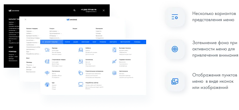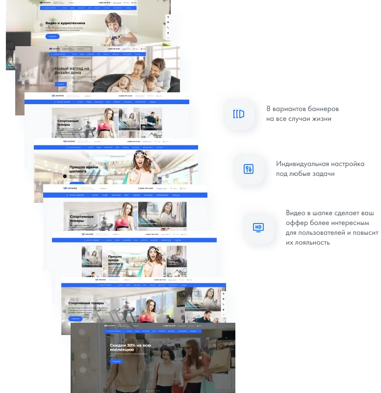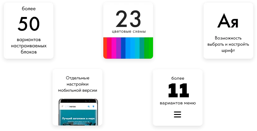 - настройка шапки сайта, футера, хедера (более 10 готовых конфигураций);