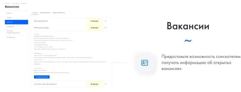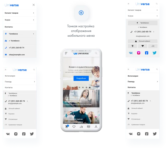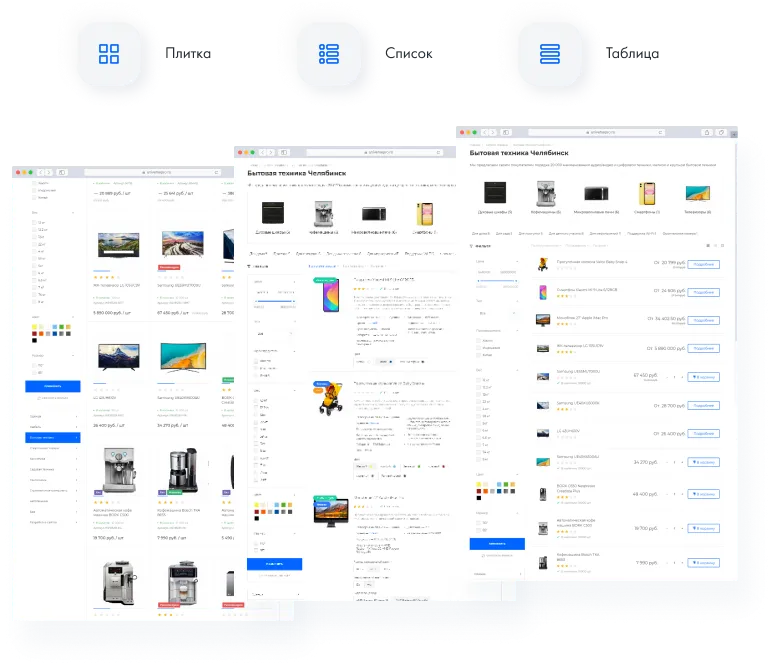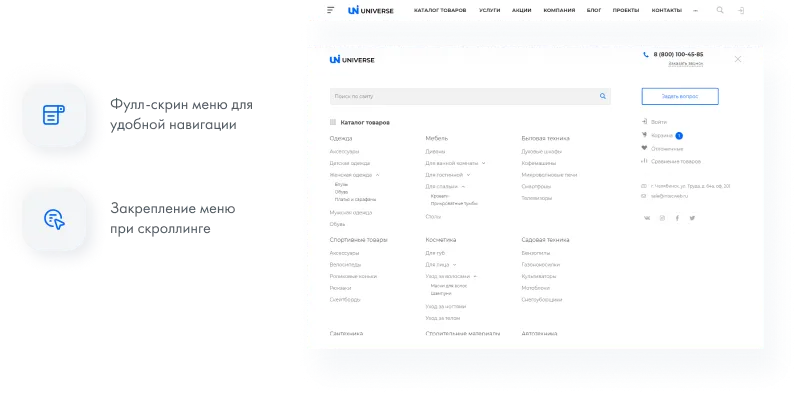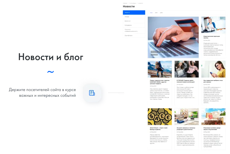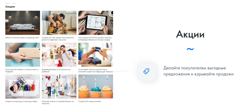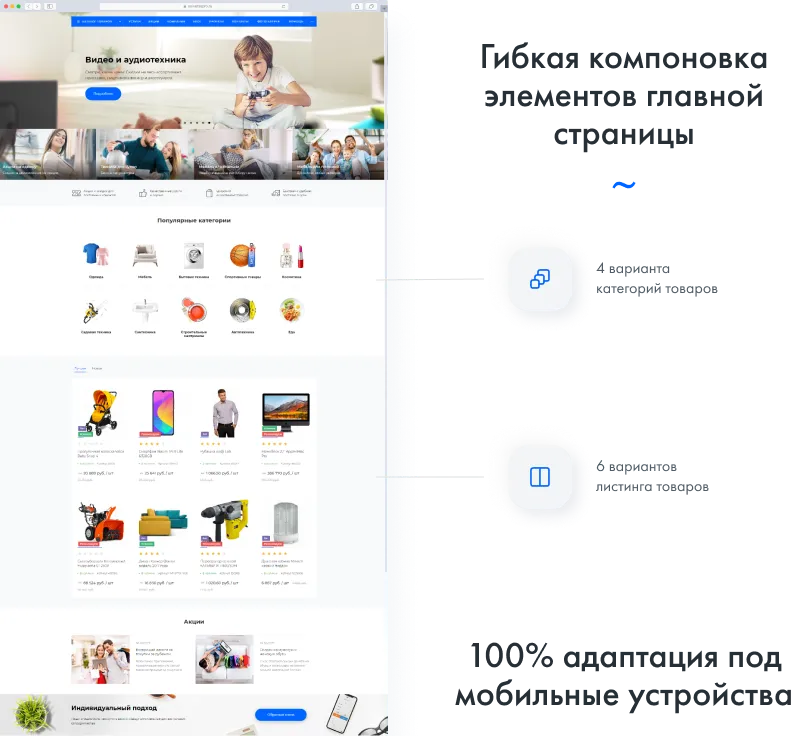 - несколько вариантов отображения основных разделов сайта: каталог, блог, новости, контакты;