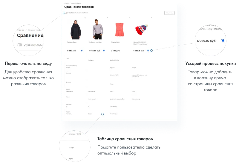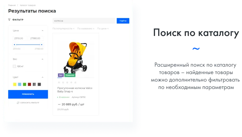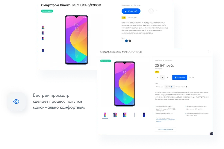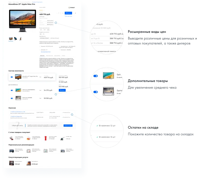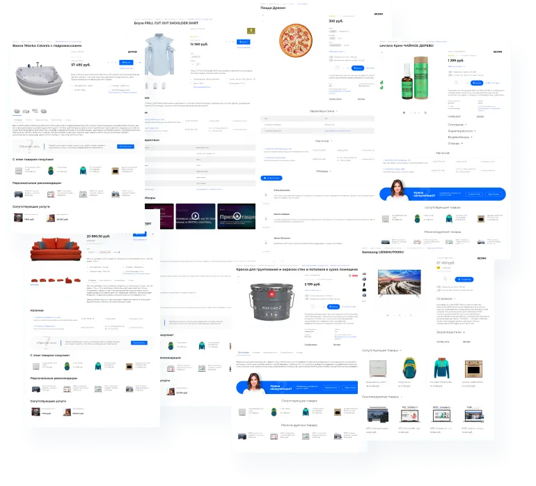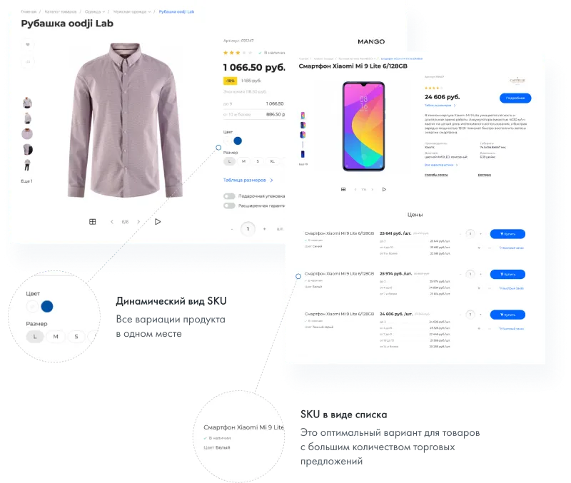 - гибкая настройка карточки товара: несколько типов товаров (промышленные товары, потребительские товары, одежда, услуги, недвижимость), выбор типа SKU, быстрый просмотр;