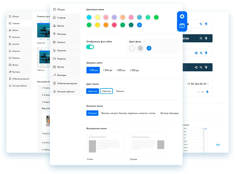 Для быстрой настройки мы предусмотрели динамическую панель, с помощью которой вы сможете изменять структуру и дизайн сайта, выбирая готовые шаблоны и включая/выключая те или иные опции сайта.