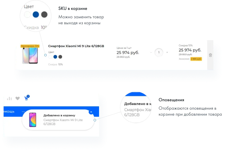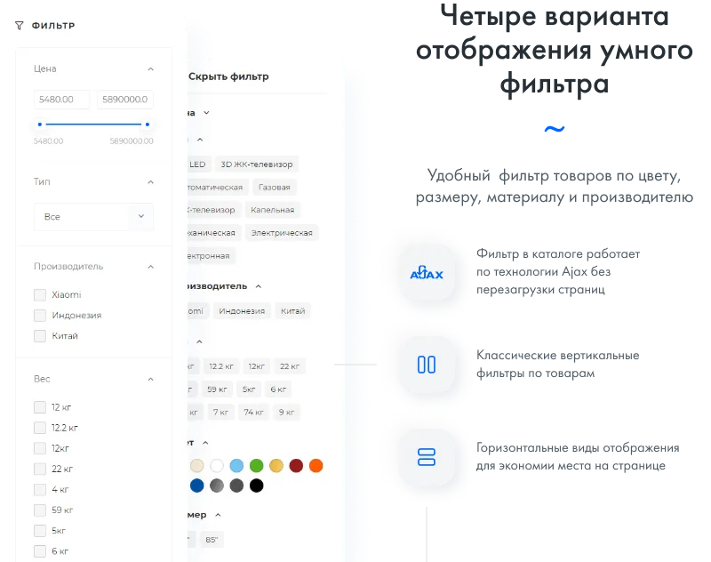 - гибкая настройка карточки товара: несколько типов товаров (промышленные товары, потребительские товары, одежда, услуги, недвижимость), выбор типа SKU, быстрый просмотр;