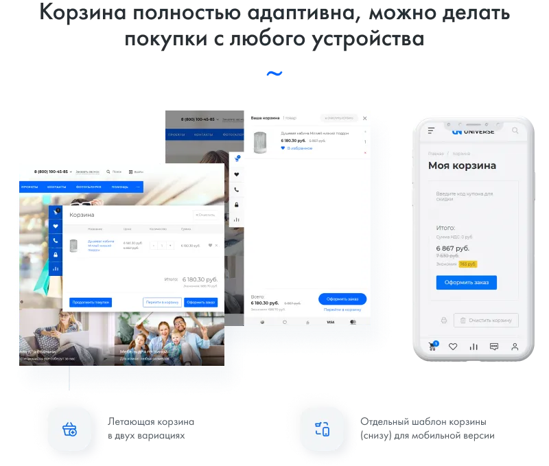 - настройка шапки сайта, футера, хедера (более 10 готовых конфигураций);