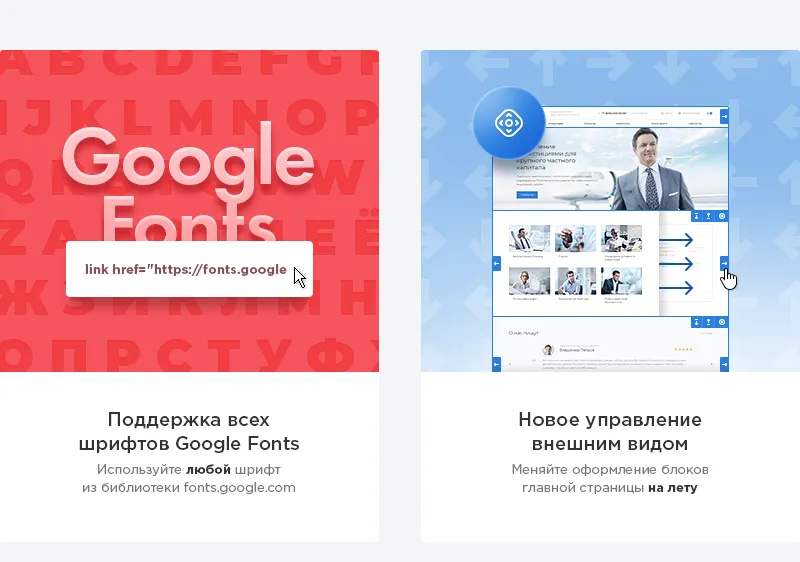Лаконичный дизайн и продуманные детали, которые подчеркнут статус компании. Вовлекайте пользователей во взаимодействие и адаптируйте сайт под свою тематику с помощью гибких настроек оформления, а также поддержки шрифтов Google Fonts.