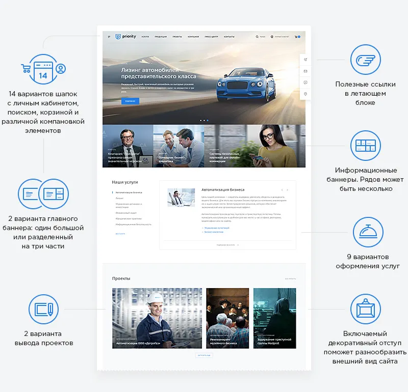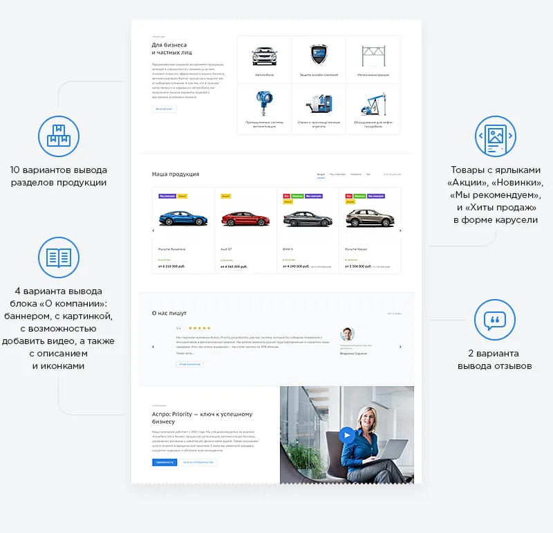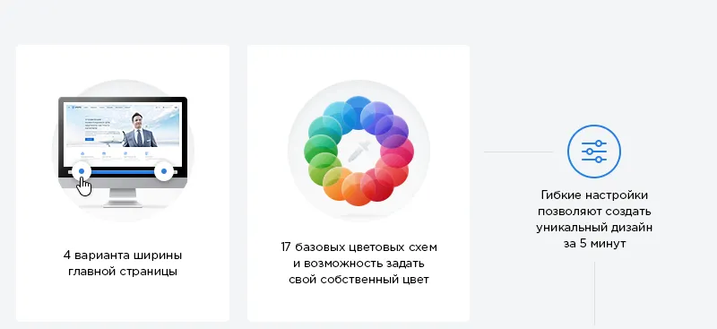 | Первый корпоративный сайт представительского класса со встроенной мультирегиональностью, простой интеграцией с популярными CRM-системами и революционным управлением настройками оформления, благодаря которым вы сможете создать свой уникальный сайт на готовом решении! |