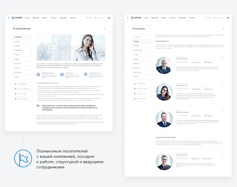 Подраздел «Сотрудники» с 3 вариантами отображения списка. Познакомьте посетителей со структурой компании, основными подразделениями и ключевыми сотрудниками, с которыми будет легко связаться.