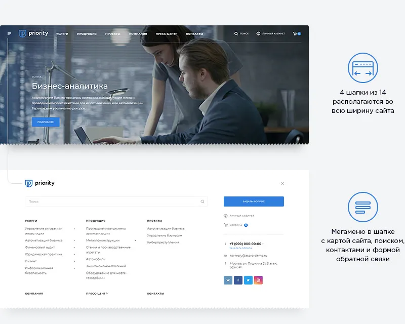 Создан с учетом специфики b2b и сложных тематик бизнеса. Сайт на основе Аспро: Приорити – полноценное веб-представительство компании для презентации ваших возможностей: экспертизы, выполненных проектов, компетенций, продукции и услуг.