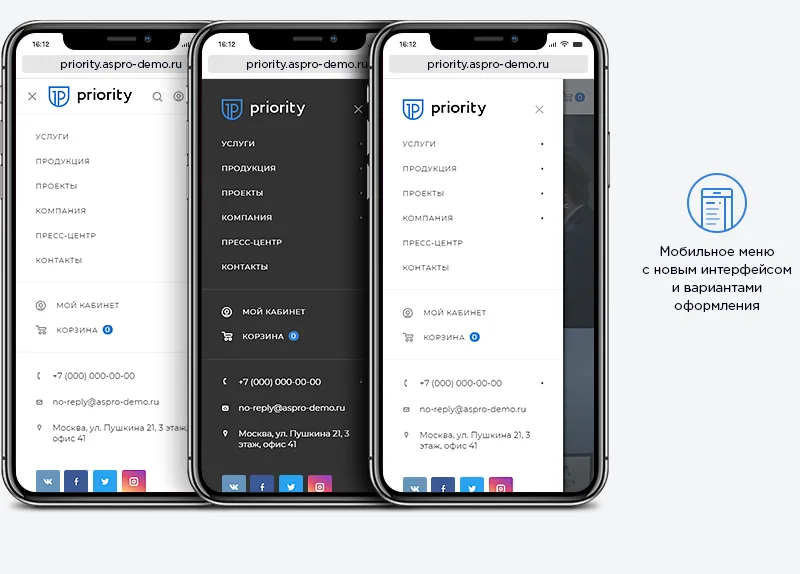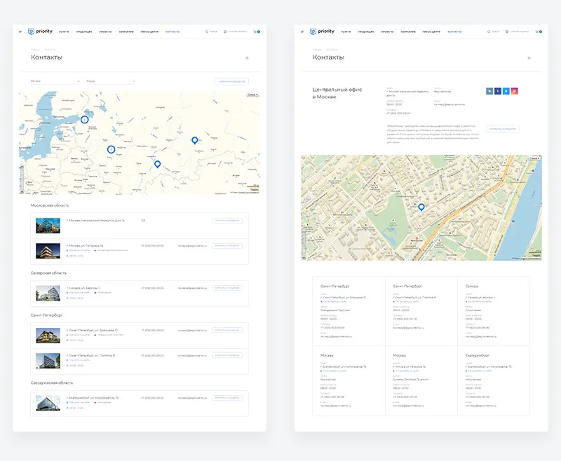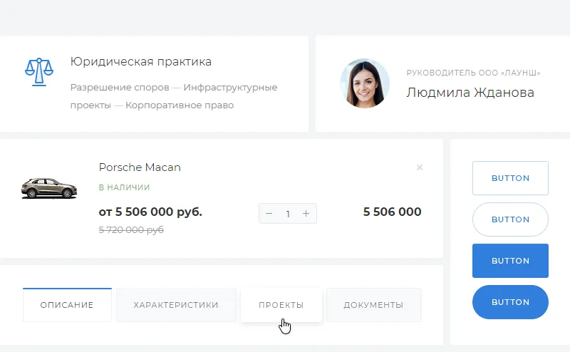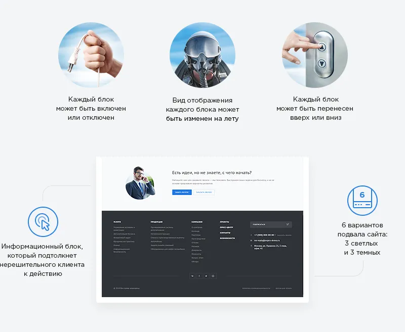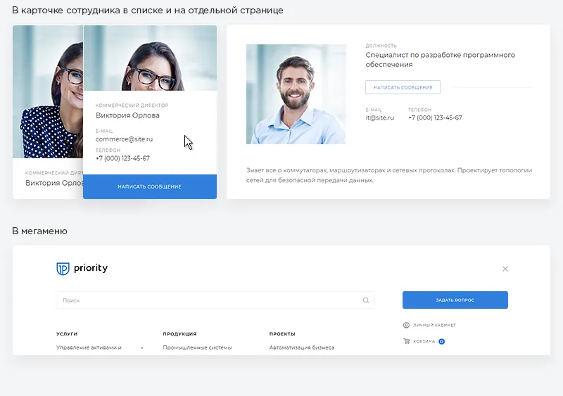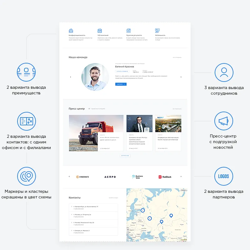 - Варианты отображения разделов «Контакты», «Блог», «Проекты», «Новости», «Компания/Наши сотрудники», «Компания/Партнеры», «Компания/Вакансии», «Компания/Лицензии»;