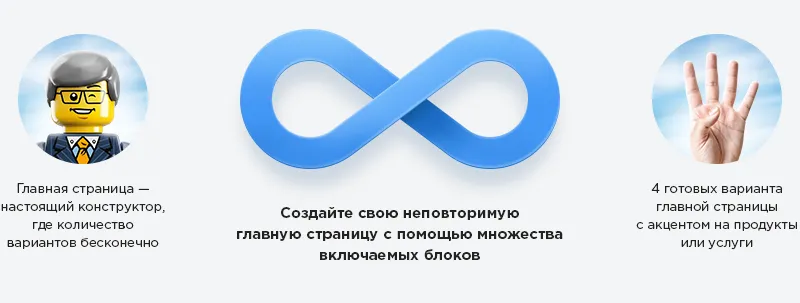 Тип главной страницы – готовые варианты с настройкой отображения блоков и возможностью изменять компоновку главной