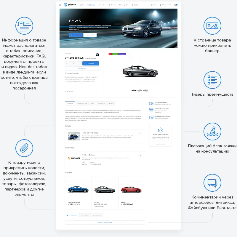 - 7 вкладок для информации о товаре: тарифы, описание, фотогалерея, реализованные проекты, характеристики, документы, FAQ