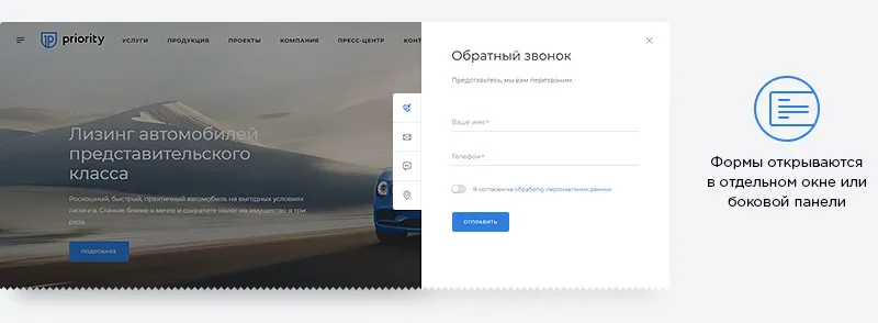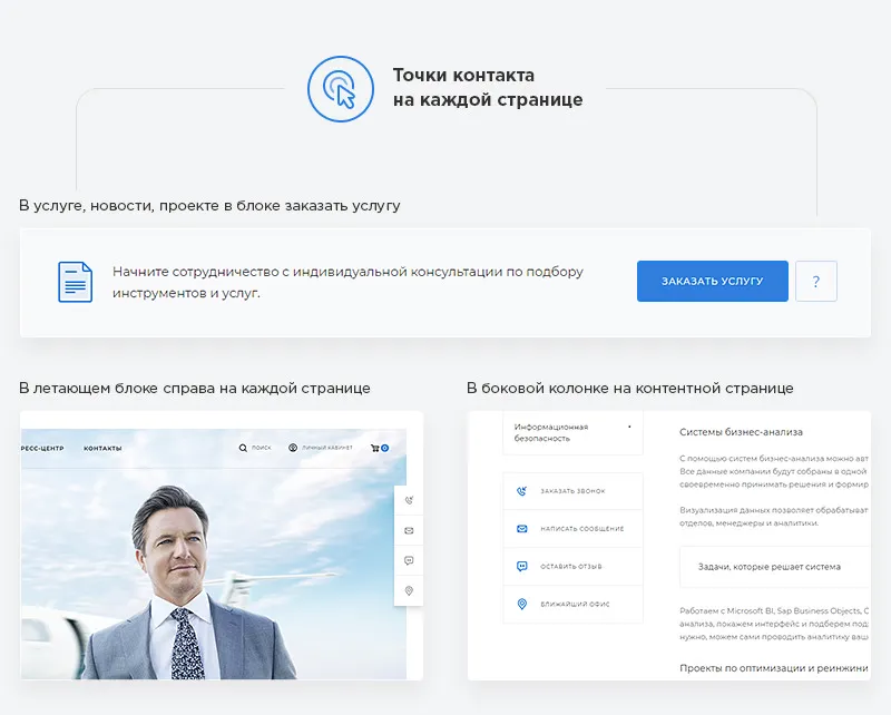 Формы «Заказать консультацию», «Задать вопрос», «Заказать услугу» или «Оформить заказ» – это точка контакта с потенциальными покупателями. В Аспро: Приорити такие точки есть на каждой странице – от каталога товаров и услуг до проектов и списка сотрудников.