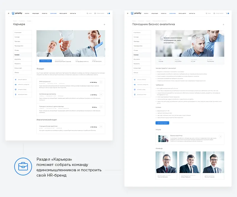 Ваш сайт – это полноценный инструмент коммуникации: с потенциальными клиентами и покупателями, партнерами и сотрудниками – теми, кто уже работает в вашей компании и потенциальными коллегами. Используйте возможности Аспро: Приорити, чтобы построить собственный HR-бренд и собрать команду единомышленников. У вас захотят работать те, кто разделяет ваши ценности!