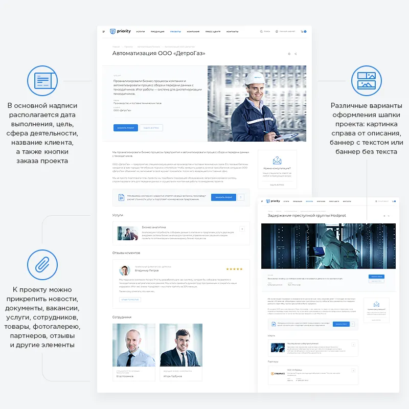 Покажите, кто из сотрудников и партнеров работал над проектом. Дополните отзывами, товарами, услугами