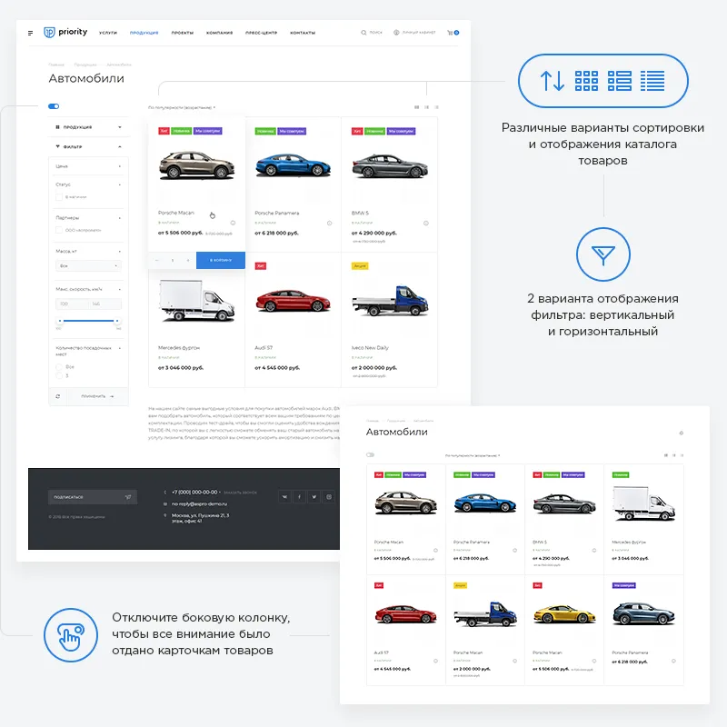 - Настройки каталога и услуг: положение умного фильтра, вид отображения элементов плиткой, отображение детальной страницы с табами или без табов, отдельные настройки для корзины;