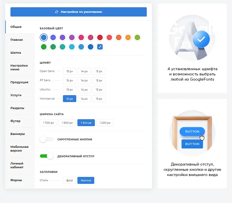 - Возможность изменять шрифт и размер шрифта, стили заголовков, ширину сайта, тип поиска, оформление заголовка и хлебных крошек;