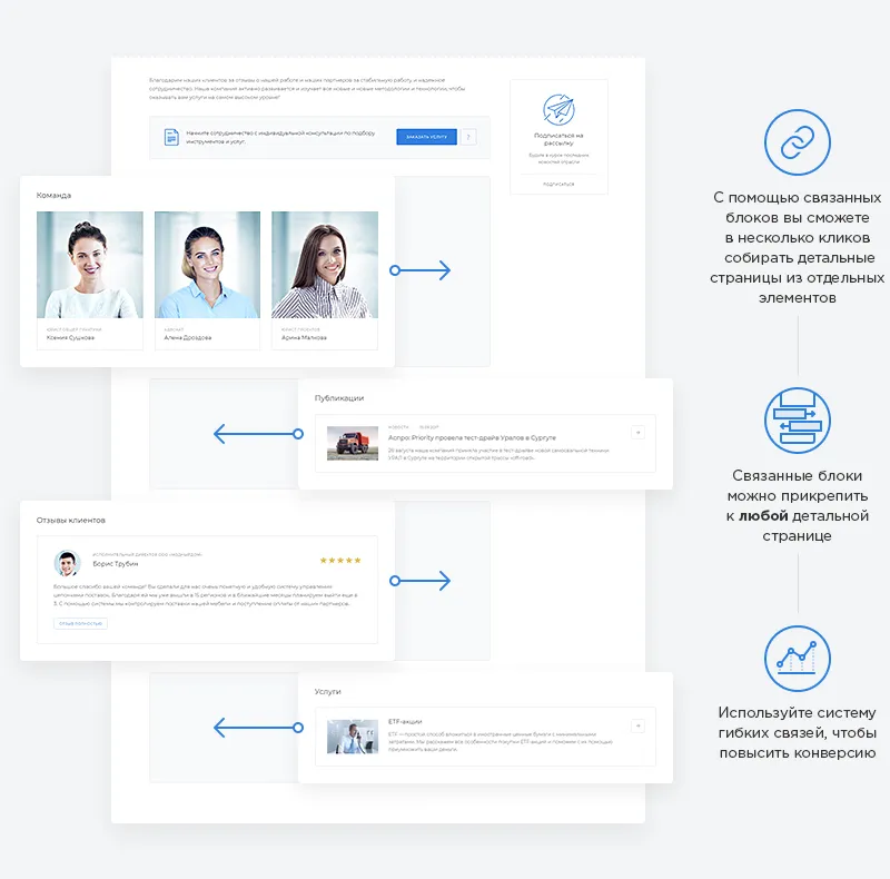 В Аспро: Приорити предусмотрена система гибких связей. С ее помощью вы сможете в несколько кликов собирать детальные страницы из отдельных элементов – отзывов, документов, связанных услуг и товаров – как из конструктора: