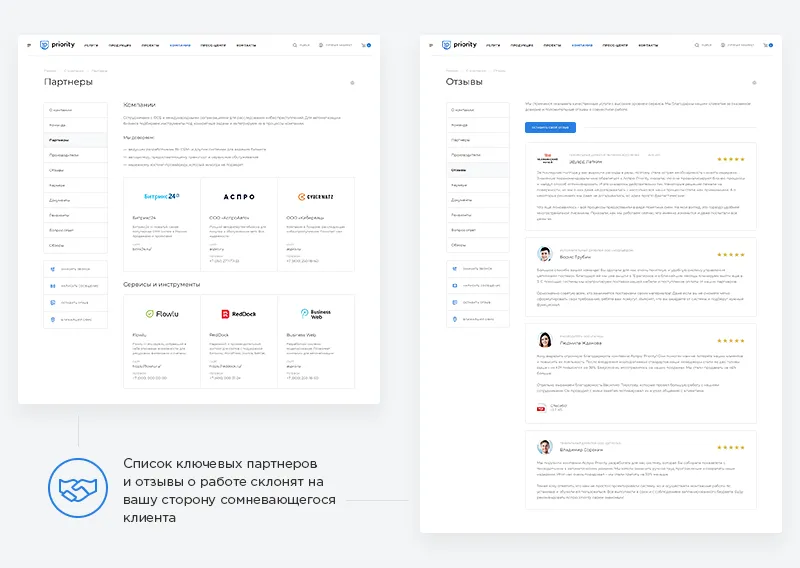 Для большого бизнеса и сложных тематик раздел «Услуги» – пожалуй, главный на всем сайте. Структура раздела и детальных страниц подскажет, как рассказать о себе максимально эффективно. Дополните описание услуги документами, отзывами, выполненными проектами, партнерами и ответственными сотрудниками. Посетители смогут заказать услугу или задать по ней вопрос в 1 клик.