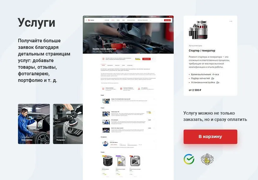 Запись на ремонт автомобиля проходит в пару кликов. Карточки услуг наполнены характеристиками, описанием работ, отзывами и видео. Вся информация представлена в наглядной и понятной форме. Воспользуйтесь готовыми страницами услуг и демонстрируйте профессионализм вашего сервиса.