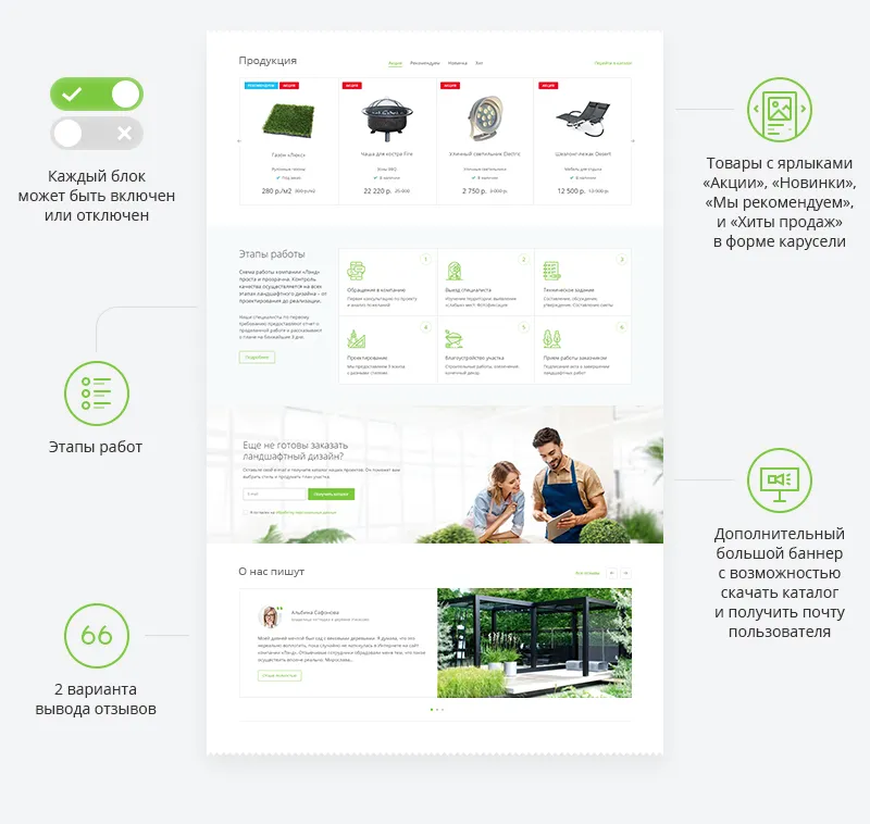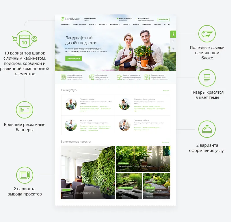 Настроить шапку и футер, выбрать цветовую схему, настроить мобильное меню – все эти возможности вам пригодятся. Но что важнее всего для ландшафтного дизайнера при представлении своей работы? Показать стиль, проекты и интересы. Для этого мы увеличили объем фото-контента на готовом решении. Выставляйте свои работы на широкоформатных баннерах, в портфолио и даже на детальных страницах каталога – используйте весь потенциал решения.