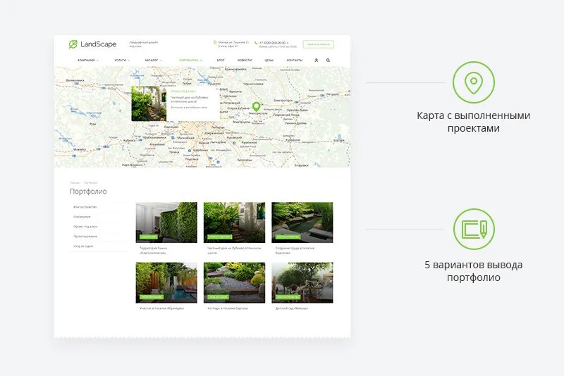 Мы создавали Аспро: Ландшафт в партнерстве с профессиональными ландшафтными дизайнерами и изучили потребности целевой аудитории «изнутри». Вам нужно всего лишь установить решение и написать свой адрес в разделе «Контакты», чтобы начать предлагать услуги. В готовом решении уже есть все необходимое для презентации студии ландшафтного дизайна.Аспро: Ландшафт легко адаптируется под любую тематику бизнеса: