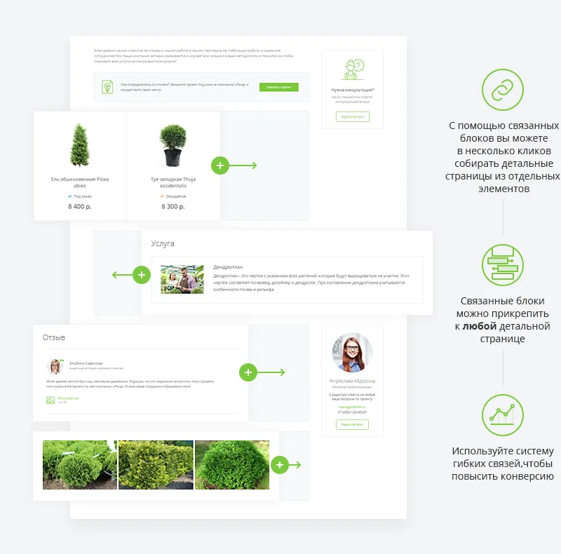 Связывайте отдельные элементы вашего сайта – проекты, услуги, отзывы, новости. Пусть составляющие дополняют друг друга и работают на увеличение конверсии. Клиент обязательно задумается над будущим уходом за участком или новой фигуркой в сад. Конечно, если вы ему напомните. Связывайте отдельные элементы в пару кликов: проекты – к услугам и товарам, товары и ответственных сотрудников – к проектам и акциям.